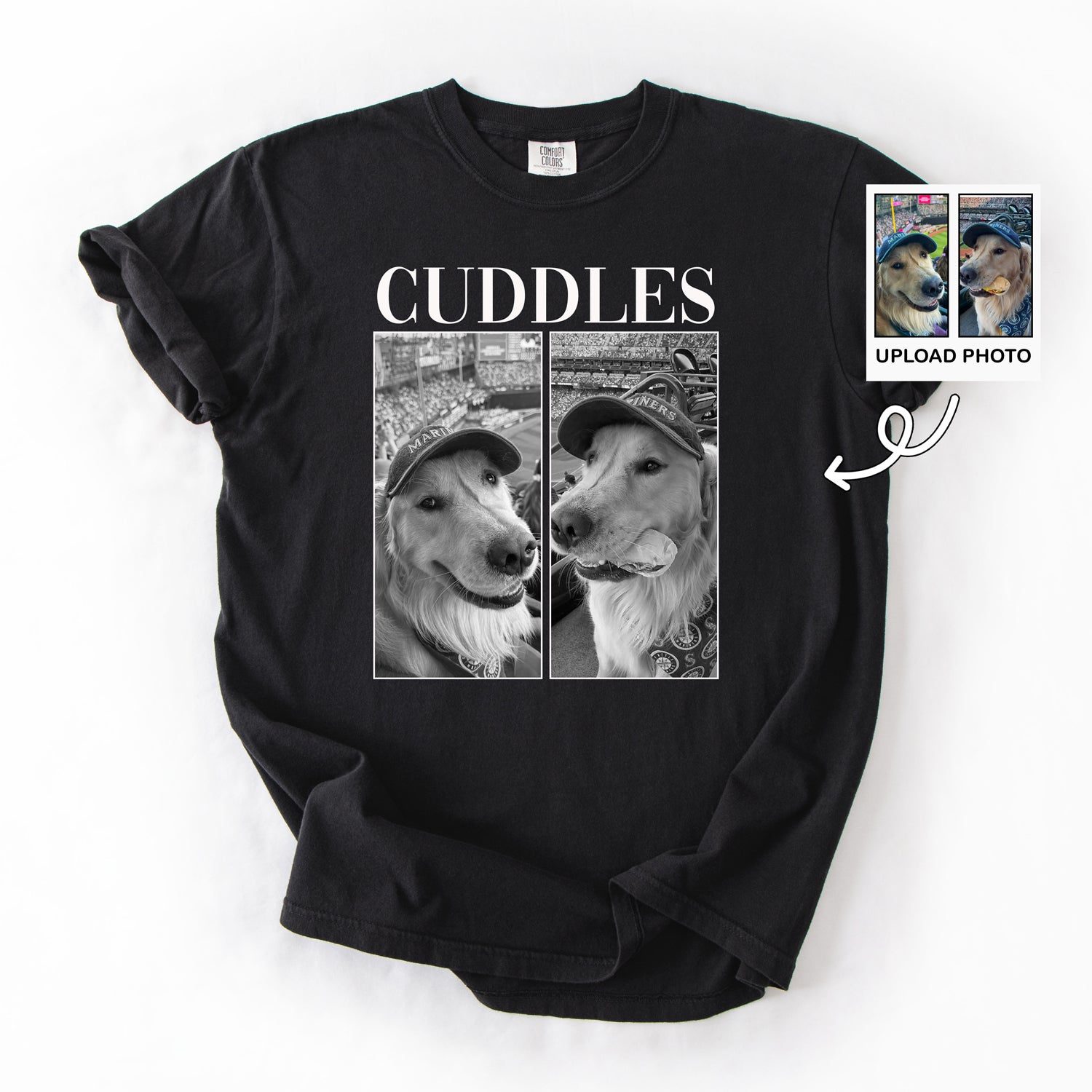 Turn your favorite pet photos into a wearable keepsake. Upload pictures of your furry bestie and add custom text (your dog’s name or a cute word like “CUDDLES”) for a tee that’s as unique as your pup. 🐾📸